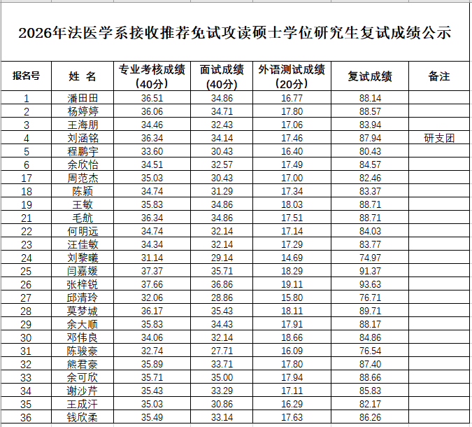 2026年QY球友会体育接收推荐免试攻读硕士学位研究生复试成绩公示